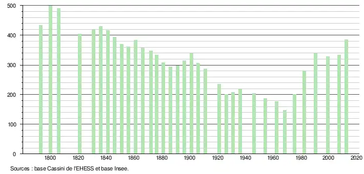 Le taux de natalité est passé de 33,9 ‰ sur la période 1968-1975 à 13,9 ‰ sur la période 1999-2009[5]. Celui du département était sur la période 1999-2009 de 12,5 ‰[6] et celui de la France métropolitaine de 12,8 ‰[7].