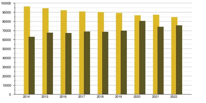 En 2014, 96 343 naissances ont été dénombrées contre 62 977 décès. Le nombre annuel des naissances a diminué depuis cette date, passant à 84 800 en 2022, indépendamment à une augmentation, mais relativement faible, du nombre de décès, avec 75 550 en 2022[Note 1]. Le solde naturel est ainsi positif et diminue, passant de 33 366 à 9 250[I 2].