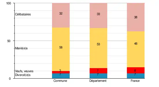 En 2009, la commune comptait 32,1 % de célibataires, 57,7 % de personnes mariées, 3,2 % de veufs ou veuves et 7 % de divorcé(e)s[10]. Le taux de personnes mariées apparaît ainsi très supérieur à celui du département (52,5 %)[11] mais aussi de la France (47,5 %)[12].