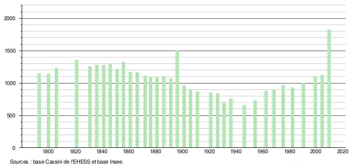 L'évolution du nombre d'habitants est connue à travers les recensements de la population effectués périodiquement dans la commune depuis 1793. Après une phase de relative stabilité au XIXe siècle, la population de la commune commune a décru pour atteindre un minimum en 1946 avec 657 habitants. Elle croît ensuite modérément puis très fortement à partir de 2000.