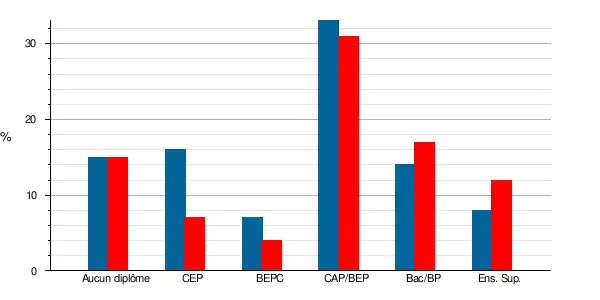 | Titulaires du certificat d'études primaires | 87 | 6,9 % | 129 | 16,2 % | 11,2 | 18,4 | 11,1 | 17,6 |