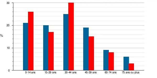 La population s'est rajeunie entre 1999 et 2009, le taux des personnes de 60 ans et plus passant de 15 % à 11 %, alors que parallèlement les populations du département et de la France ont quant à elles vieilli, passant respectivement de 18 à 20 % pour le Département et de 20 à 23 % pour la France métropolitaine.