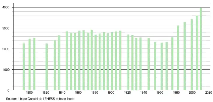 L'évolution du nombre d'habitants est connue à travers les recensements de la population effectués périodiquement dans la commune depuis 1793. Après une phase de relative stabilité au XIXe siècle et au début du XXe siècle, la population de la commune a cru de manière modérée mais continue depuis les années 1960.