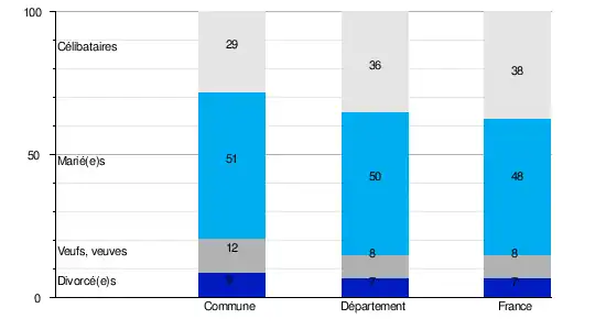 L'état matrimonial légal désigne, selon l'Insee, la situation conjugale d'une personne au regard de la loi : célibataire, mariée, veuve, divorcée[Note 2].En 2009, la commune comptait 29,1 % de célibataires, 50,7 % de personnes mariées, 11,5 % de veufs ou veuves et 8,7 % de divorcé(e)s[13]. Le taux de personnes mariées apparaît ainsi supérieur à celui du département (49,8 %)[14] mais aussi de la France (47,5 %)[15].