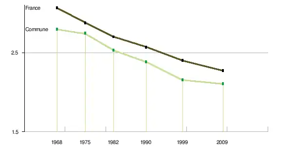 Le taux de natalité est passé de 16,9 ‰ sur la période 1968-1975 à 9,8 ‰ sur la période 1999-2009[5]. Celui du département était sur la période 1999-2009 de 13,1 ‰[6] et celui de la France métropolitaine de 12,8 ‰[8].