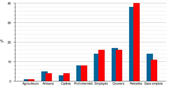 La commune comptait par ailleurs, en 2009, 1282 retraités, soit 39,7 % de la population de la commune et 12,4 % de plus que le taux départemental. Cet écart s'est toutefois réduit par rapport à celui de 1999 puisqu'il était alors de 15,2 %.