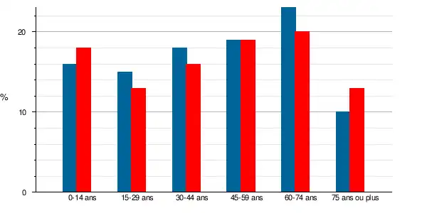 Le taux des personnes de 60 ans et plus de la commune est resté stable entre 1999 et 2009, au niveau de 33 %, alors que parallèlement les populations du département et de la France ont quant à elles vieilli, passant respectivement de 20 à 23 % pour le Département et de 20 à 23 % pour la France métropolitaine.