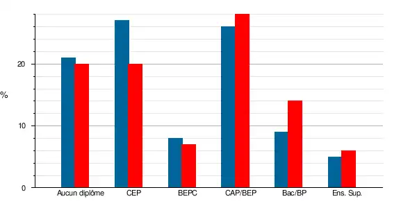 | Titulaires du certificat d'études primaires | 612 | 20,3 % | 745 | 27,4 % | 12,4 | 19 | 11,1 | 17,6 |