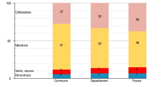 En 2009, la commune comptait 27,2 % de célibataires, 60,5 % de personnes mariées, 6,2 % de veufs ou veuves et 6,2 % de divorcé(e)s[11]. Le taux de personnes mariées apparaît ainsi très supérieur à celui du département (52,5 %)[12] mais aussi de la France (47,5 %)[13].