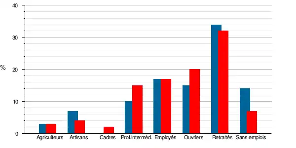 | Artisans, commerçants, chefs d'entreprise | 25 | 3,9 | 36 | 7,4 | 3,7 | 4,2 | 3,3 | 3,5 |