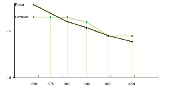 Le nombre de ménages[Note 3] tend à croître plus vite que la population : + 1,72 % par an en moyenne en France métropolitaine pour le nombre de ménages entre 1968 et 2009, + 0,74 % pour la population (tableau ci-après). Le nombre moyen de personnes par ménage tend en effet à baisser : égal à 3,06 en 1968, il n’est plus que de 2,4 en 1999 et de 2,27 en 2009[16]. La tendance est similaire pour la commune. Le nombre moyen de personnes par ménage tend également à baisser : égal à 2,8 en 1968, il n’est plus que de 2,39 en 1999 et de 2,39 en 2009[13].