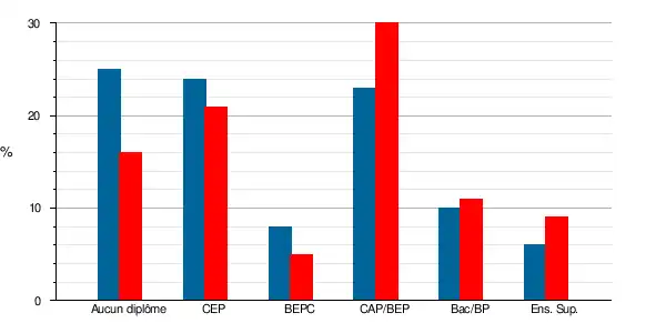 | Titulaires du certificat d'études primaires | 31 | 21,1 % | 34 | 23,9 % | 12,4 | 19 | 11,1 | 17,6 |