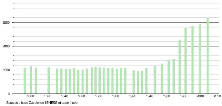 L'évolution du nombre d'habitants est connue à travers les recensements de la population effectués périodiquement dans la commune depuis 1793. Après une phase de stabilité au XIXe siècle et au début du XXe siècle, la population de la commune a crû relativement fortement à partir des années 1950.