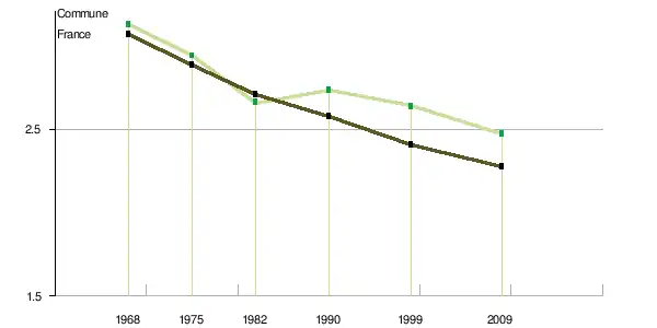 Le nombre de ménages[Note 3] tend à croître plus vite que la population : + 1,72 % par an en moyenne en France métropolitaine pour le nombre de ménages entre 1968 et 2009, + 0,74 % pour la population (tableau ci-après). Le nombre moyen de personnes par ménage tend en effet à baisser : égal à 3,06 en 1968, il n’est plus que de 2,4 en 1999 et de 2,27 en 2009[16]. La tendance est similaire pour la commune. Le nombre moyen de personnes par ménage tend également à baisser : égal à 3,12 en 1968, il n’est plus que de 2,64 en 1999 et de 2,47 en 2009[13].