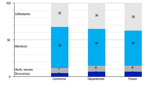 L'état matrimonial légal désigne, selon l'Insee, la situation conjugale d'une personne au regard de la loi : célibataire, mariée, veuve, divorcée[Note 2].En 2009, la commune comptait 32,4 % de célibataires, 56,2 % de personnes mariées, 6,5 % de veufs ou veuves et 4,9 % de divorcé(e)s[13]. Le taux de personnes mariées apparaît ainsi très supérieur à celui du département (49,8 %)[14] mais aussi de la France (47,5 %)[15].