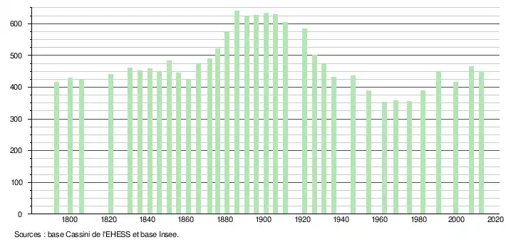 L'évolution du nombre d'habitants est connue à travers les recensements de la population effectués périodiquement dans la commune depuis 1793. Après avoir crû au XIXe siècle et atteint un maximum en 1881 avec 574 habitants, la population de la commune décroît de 1920 à 1962 avec un minimum à 353 habitants avant de croître modérément et se stabiliser au début des années 1990.