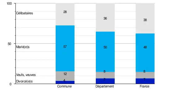 L'état matrimonial légal désigne, selon l'Insee, la situation conjugale d'une personne au regard de la loi : célibataire, mariée, veuve, divorcée[Note 2].En 2009, la commune comptait 27,5 % de célibataires, 56,6 % de personnes mariées, 11,8 % de veufs ou veuves et 4,1 % de divorcé(e)s[13]. Le taux de personnes mariées apparaît ainsi très supérieur à celui du département (49,8 %)[14] mais aussi de la France (47,5 %)[15].