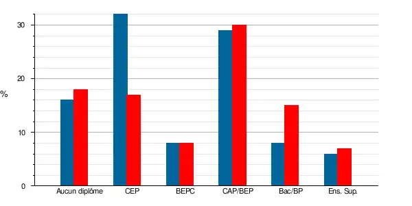 | Titulaires du certificat d'études primaires | 66 | 17,4 % | 104 | 31,5 % | 12,4 | 19 | 11,1 | 17,6 |