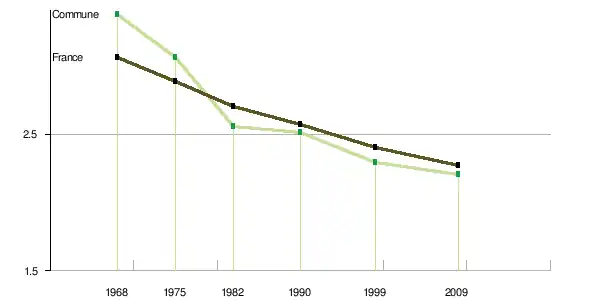 Le nombre de ménages[Note 3] tend à croître plus vite que la population : + 1,72 % par an en moyenne en France métropolitaine pour le nombre de ménages entre 1968 et 2009, + 0,74 % pour la population (tableau ci-après). Le nombre moyen de personnes par ménage tend en effet à baisser : égal à 3,06 en 1968, il n’est plus que de 2,4 en 1999 et de 2,27 en 2009[16]. La tendance est similaire pour la commune. Le nombre moyen de personnes par ménage tend également à baisser : égal à 3,37 en 1968, il n’est plus que de 2,29 en 1999 et de 2,2 en 2009[13].
