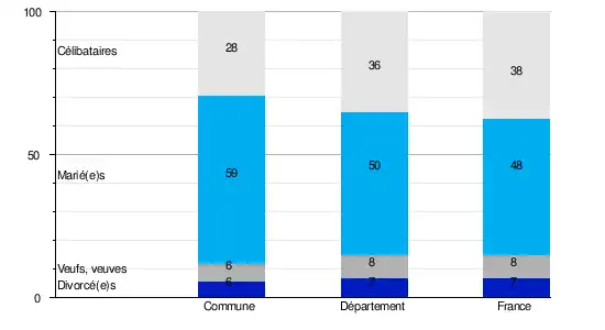 L'état matrimonial légal désigne, selon l'Insee, la situation conjugale d'une personne au regard de la loi : célibataire, mariée, veuve, divorcée[Note 2].En 2009, la commune comptait 28,2 % de célibataires, 59,1 % de personnes mariées, 6,4 % de veufs ou veuves et 6,3 % de divorcé(e)s[13]. Le taux de personnes mariées apparaît ainsi très supérieur à celui du département (49,8 %)[14] mais aussi de la France (47,5 %)[15].