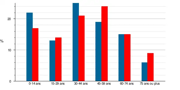 La population a vieilli entre 1999 et 2009, le taux des personnes de 60 ans et plus passant de 21 % à 24 %, à l'instar des populations du département et de la France qui sont aussi passées respectivement de 20 à 23 % pour le Département et de 20 à 23 % pour la France métropolitaine.