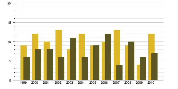 | 1968 à 1975 | 1975 à 1982 | 1982 à 1990 | 1990 à 1999 | 1999 à 2009 | ||