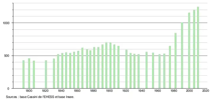 L'évolution du nombre d'habitants est connue à travers les recensements de la population effectués périodiquement dans la commune depuis 1793. Après avoir crû au XIXe siècle et atteint un maximum en 1896 avec 701 habitants, la population de la commune décroît jusqu'en 1936 avec un minimum à 521 habitants avant de croître à nouveau fortement à partir des années 1970.