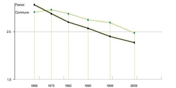 Le nombre de ménages[Note 3] tend à croître plus vite que la population : + 1,72 % par an en moyenne en France métropolitaine pour le nombre de ménages entre 1968 et 2009, + 0,74 % pour la population (tableau ci-après). Le nombre moyen de personnes par ménage tend en effet à baisser : égal à 3,06 en 1968, il n’est plus que de 2,4 en 1999 et de 2,27 en 2009[16]. La tendance est similaire pour la commune. Le nombre moyen de personnes par ménage tend également à baisser : égal à 2,91 en 1968, il n’est plus que de 2,69 en 1999 et de 2,47 en 2009[13].