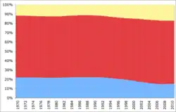La structure par âge du pays est relativement stable entre 1970 et 1990, la population âgée de 0 à 14 ans représente environ 22 % de la population totale, la population entre 15 et 65 ans, environ 66 % et les personnes de 65 ans et plus, environ 12 % de la population. Mais de par la diminution des naissances après 1990, la population de 0 à 14 ans ne représente plus que 15 % de la population en 2009, quand la population de 65 ans et plus, représente environ 17 % de la population en 2009, ce qui est relativement modeste à l'échelle européenne, et celle entre 15 et 64 ans, 68 % de la population de 2009[18].