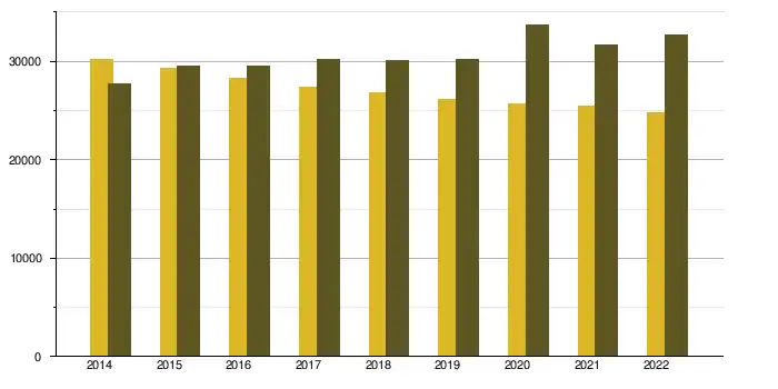 En 2014, 30 214 naissances ont été dénombrées contre 27 698 décès. Le nombre annuel des naissances a diminué depuis cette date, passant à 24 809 en 2022, indépendamment à une augmentation, mais relativement faible, du nombre de décès, avec 32 637 en 2022. Le solde naturel est ainsi négatif et diminue, passant de 2 516 à −7 828[I 2].