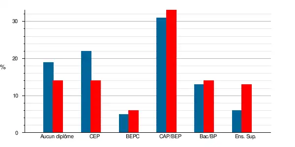 | Titulaires du certificat d'études primaires | 179 | 13,9 % | 238 | 22,3 % | 12,4 | 19 | 11,1 | 17,6 |
