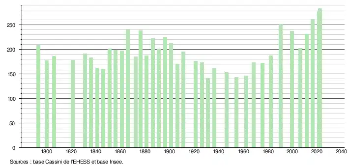 L'évolution du nombre d'habitants est connue à travers les recensements de la population effectués dans la commune depuis 1793. Pour les communes de moins de 10 000 habitants, une enquête de recensement portant sur toute la population est réalisée tous les cinq ans, les populations de référence des années intermédiaires étant quant à elles estimées par interpolation ou extrapolation[21]. Pour la commune, le premier recensement exhaustif entrant dans le cadre du nouveau dispositif a été réalisé en 2006[22].