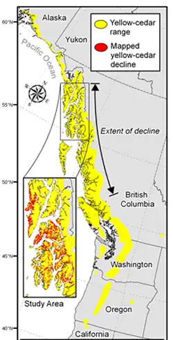 - 1 2 (en) « Forest Disturbance Processes -Climate Change and Yellow-Cedar Decline », US Forest Service - Northern Research Station (consulté le ).