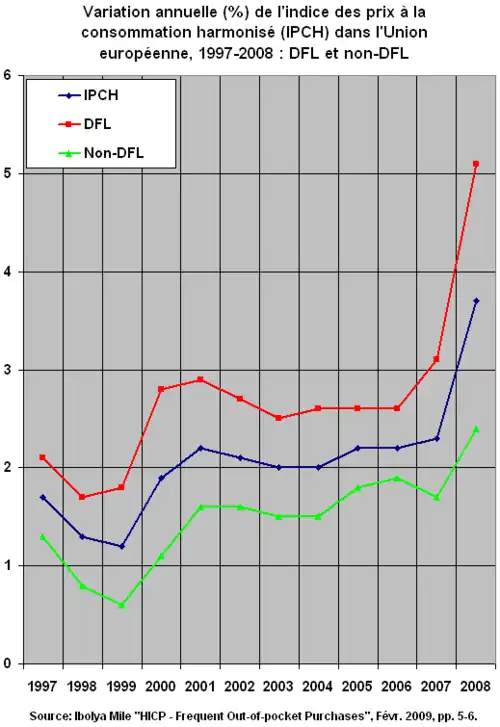 De plus, depuis , et pour la première fois en 12 ans, l’indice des prix des DFL croît moins vite que celui des non-DFL (second graphique). Pour certains observateurs à cette époque, ce phénomène était susceptible d'entraîner chez un grand nombre de consommateurs un ressenti de la hausse des prix moindre que l'inflation réelle et par voie de conséquence une reprise de la consommation des ménages[4].