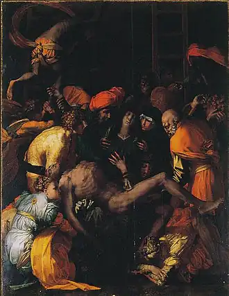 L'œuvre s'inspire principalement de la Déposition de Croix (1521), dont elle reprend le fond avec la croix et les trois escaliers, ainsi que la figure du déposant sur l'escalier de gauche. Le choix iconographique a été décidé par les commissionnaires, comme le stipule le contrat. Conformément à l'Évangile selon Matthieu, la scène se déroule de nuit, après que le ciel se soit soudainement assombri à la suite de la mort du Christ (27:45 ; 57). Le moment représenté est cependant plus tardif, alors que le corps du Christ, nu et affichant une cage thoracique gonflée, a déjà été descendu de la croix et offert au deuil des spectateurs. La lumière s'attarde principalement sur les personnages du premier plan, reléguant l'arrière-plan dans l'obscurité.
