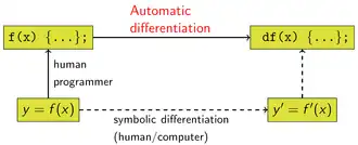 En mathématique et en calcul formel, la dérivation automatique (DA), également appelé dérivation algorithmique, dérivation formelle[1],[2], ou auto-dérivation est un ensemble de techniques d'évaluation de la dérivée d'une fonction par un programme informatique.