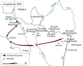 Les armées allemandes franchissent la frontière entre le Rhin et le Luxembourg, bousculant les armées impériales. L'armée française multipliera les défaites et les victoires inexploitées, notamment celles de Frœschwiller, Borny-Colombey, Mars-la-Tour ou Saint-Privat. L'incapacité des officiers de haut rang de l'armée française, le manque de préparation à la guerre des quartiers généraux, l'irresponsabilité des officiers, l'absence d'un plan de contingence et le fait de compter sur la chance, stratégie précédemment fructueuse pour l'Empereur, plutôt qu'une stratégie élaborée, apparaissent rapidement lors de l'insignifiant engagement de Sarrebruck. Les premiers revers d'août 1870 sont imputés à Napoléon III et à Ollivier, ce qui fournit à la Chambre l'occasion de renverser le Premier ministre, à une écrasante majorité, le , laissant l'empereur seul sur la ligne de front, qu'elle soit politique ou militaire. Pendant que Napoléon III cherche « la mort sur le champ de bataille »[19], l'impératrice Eugénie, régente, nomme le bonapartiste autoritaire Cousin-Montauban, comte de Palikao, à la tête du gouvernement. Sous la pression de l'impératrice, Napoléon III renonce à se replier sur Paris et marche vers Metz au secours du maréchal Bazaine encerclé[20]. Ses troupes sont elles-mêmes alors encerclées à Sedan. Le 2 septembre 1870, Napoléon III dépose les armes au terme de la bataille de Sedan et tente de négocier les clauses de la capitulation avec Bismarck près du village de Donchery.