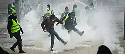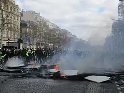 Le 24 novembre, de nombreux barrages policiers sont installés à Paris. Mais face à l’importance de la foule, les forces de l’ordre laissent les Gilets jaunes pénétrer sur l’avenue des Champs-Élysées. Des barricades sont incendiées, plusieurs abribus sont cassés et des vitrines de commerces brisées. Des incidents font 24 blessés, dont cinq issus des forces de l'ordre, et conduisent à 101 arrestations[43]. À plusieurs endroits, les manifestants sont dispersés au moyen de gaz lacrymogènes et canons à eau[44],[45]. Une polémique intervient concernant l'origine des violences : alors que le gouvernement accuse l'ultra-droite[46], des groupes d'extrême gauche sont mis en cause[b],[48]. Après avoir annoncé 106 301 manifestants dans toute la France, le ministère de l'Intérieur revient sur son comptage huit jours plus tard en faisant état de 166 000 manifestants[49],[50],[51],[52]. Le syndicat de police France Police - Policiers en colère en dénombre 750 000[53].