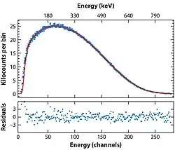L’énergie de désintégration (basée sur les masses du neutron, du proton et de l’électron fournies par le CODATA 2014[5]) est égale à 0,782 333 05 MeV. Cette valeur est en accord avec l’énergie maximale de l’électron produit lors de la désintégration qui a été mesurée à 0,782 ± 0,013 MeV[6]. Cette dernière valeur n’est pas assez précise pour déterminer la masse au repos de l’antineutrino (qui doit en théorie être soustraite de l’énergie cinétique maximale de l’électron) ; celle-ci est contrainte par d’autres méthodes[7]. Par ailleurs, l’énergie cinétique maximale du proton est 751 eV[8].