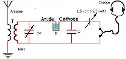 Un circuit composé d'une pile, d'un potentiomètre et d'un écouteur applique une tension au détecteur électrolytique (cuve d'électrolyse). La polarisation électrolytique de l'anode est très rapide. L'anode est un fil de platine très fin de 1/100 de millimètre. Le signal alternatif du circuit inductance-condensateur dépolarise partiellement l'anode aux rythmes de la modulation d'amplitude, ce qui oblige la pile électrique à fournir un nouveau courant pour repolariser l'anode. L'écouteur parcouru par ce courant repolarisant aux rythmes de la modulation d'amplitude fait entendre une image de la modulation (la cathode est un petit godet de platine ou de plomb ou une plaque métallique ou un gros fil de platine ou de plomb).