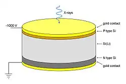 Un détecteur Silicium-Lithium (Si-(Li)) est constitué principalement d'une jonction silicium de type diode p-i-n de 3 à 5 mm d'épaisseur polarisée par une tension d'environ −1000 V. La partie centrale dopée au lithium forme la couche non conductrice i (intrinsèque), où le Li compense les accepteurs résiduels qui sinon rendraient la couche de type p. Quand un photon X traverse le détecteur, cela provoque la création de paires électrons-trous et induit un saut de tension. Pour obtenir une conductivité suffisamment faible, le détecteur doit être maintenu à basse température, et un refroidissement à l'azote liquide doit être utilisé pour avoir une bonne résolution. Avec une certaine perte de résolution, un système de refroidissement Peltier peut être utilisé[1].