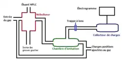 Il existe trois grandes étapes pour décrire le fonctionnement du détecteur : la nébulisation du solvant et des analytes, qui est le principe de mettre en fines gouttelettes en phase gazeuse ; ajouter une charge positive aux molécules pour pouvoir en faire la détection ; finalement la détection des molécules chargées dans un électromètre.