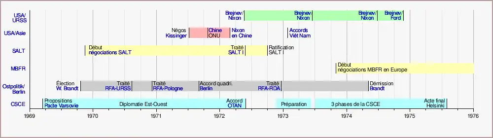 La détente Est-Ouest se construit entre 1969 et 1975 autour de plusieurs dimensions en parallèle. Entre les États-Unis et l'URSS elle se traduit par la reprise du dialogue, symbolisée par quatre sommets, un premier accord de limitation des armes nucléaires stratégiques (SALT I) et l'ouverture de négociations sur les forces conventionnelles en Europe (MBFR). La visite de Nixon en Chine communiste illustre de façon spectaculaire la reprise des relations, interrompues depuis 1949. Les accords de Paris marquent la fin de l'engagement américain au Viet Nâm. En Europe, l'Ostpolitik menée par Willy Brandt normalise les relations de la RFA avec l'URSS, la RDA et la Pologne. Elle ouvre la porte à l'ouverture de la Conférence sur la sécurité et la coopération en Europe.