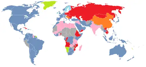 Carte du monde montrant par un code couleur les alliances au début des années 1970 :