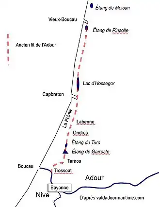 Selon les hypothèses de Ch. Duffart (1897), vers l'an 1000, l'Adour se jette dans le golfe de Gascogne par plusieurs bras : le principal au niveau de Capbreton, les autres plus au Nord en partant de Dax via Magescq, la dépression de Soustons et le havre de Vieux-Boucau. On peut parler alors d'un véritable delta de l'Adour dans le pays de Maremne. Les divers étangs subsistant aujourd'hui en sont des témoins avec des traces d'alluvions arrachées incontestablement aux roches pyrénéennes.