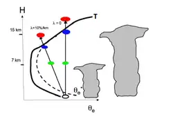Diagramme montrant la variation de la température (T) avec l'altitude pour l'environnement et l'effet du taux d'entraînement () sur la hauteur du sommet d'un cumulonimbus