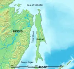 Carte de Sakhaline séparée du continent par le détroit de Tatarie. | ||||