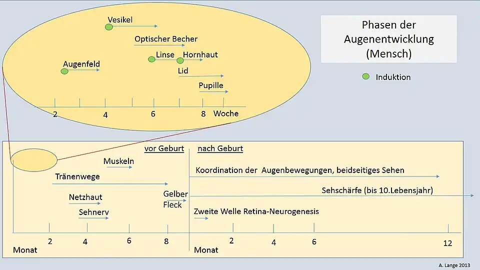 La majeure partie du développement complexe de la rétine se déroule chez l'homme en une onde de croissance de cellules coordonnée à partir du milieu du 3e mois jusqu'au 4e. Puis, le nerf optique est complètement myélinisé pour conduction adéquate du signal. La tache jaune (macula lutea) avec la plus haute densité de cellules spéciales (cônes) ne commence à se développer qu'après 8 mois[27]. Elle continue à croître jusqu'après la naissance. Après environ 5 mois, la liaison nerveuse de l'œil avec le cerveau est terminée. L'embryon présente dès le 7e mois de grossesse certaines formes de mouvements de l'œil, appelées REM (Rapid Eye Movement), qui soutiennent la synchronisation de la rétine avec le cortex visuel dans le cerveau[28].