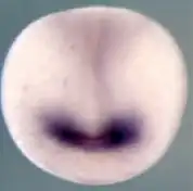 Le développement de la plaque neurale en forme de semelle sur la gastrula (Fig. 4, surface gris clair), dont provient tout d'abord le tube neural (Fig. 4, bande médiane verticale), puis plus tard le cerveau et la moelle épinière, est déclenché par le mésoderme situé en dessous (induction), et il se forme ensuite un champ oculaire sur cette plaque (Fig. 4, violet). Les gènes cités, Rx1, Six3 et Pax6 sont essentiels pour ces étapes initiales. Pendant la formation du tube neural, le champ oculaire se partage en deux domaines oculaires externes, sous la direction du gène Sonic hedgehog (Shh), qui est activé sur une ligne médiane entre ces deux domaines, et y réprime Pax6. Sonic hedgehog donne ainsi l'explication du fait que les vertébrés ont deux yeux. S'il ne s'exprime pas à ce moment, se développe une cyclopie[13]. L'activation (expression) manquante des gènes cités conduit à l'absence de formation des yeux[8].