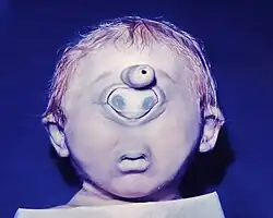 Sans doute la plus spectaculaire erreur de formation est l'œil de cyclope déjà évoqué, la cyclopie. En l'absence de séparation des deux bases oculaires, il se forme un conglomérat de parties de l'œil au milieu de la moitié supérieure du visage (Fig. ci-contre) En raison de la malfaçon corrélative du cerveau, les fœtus ne sont pas viables. Une clôture incomplète de la coupe oculaire embryonnaire conduit à des formations fendues, « colobomes » d'étendue variable : colobome de l'iris, de la choroïde, de la rétine. Les maladies virales de la mère pendant le premier tiers de la grossesse, mais aussi la prise de nombreux médicaments, peuvent conduire à des troubles du développement. On connaît le trouble du cristallin, à côté d'autres dommages, dus à la rubéole pendant la 4e à la 8e semaine de grossesse, soit dans la phase de développement du cristallin. Des restes de la membrane pupillaire, malformations dues à de mauvais enchaînements, ne sont pas rares, et sont sans inconvénient. Ils ont aussi été étudiés et décrits chez d'autres vertébrés (rat, lapin)[44].